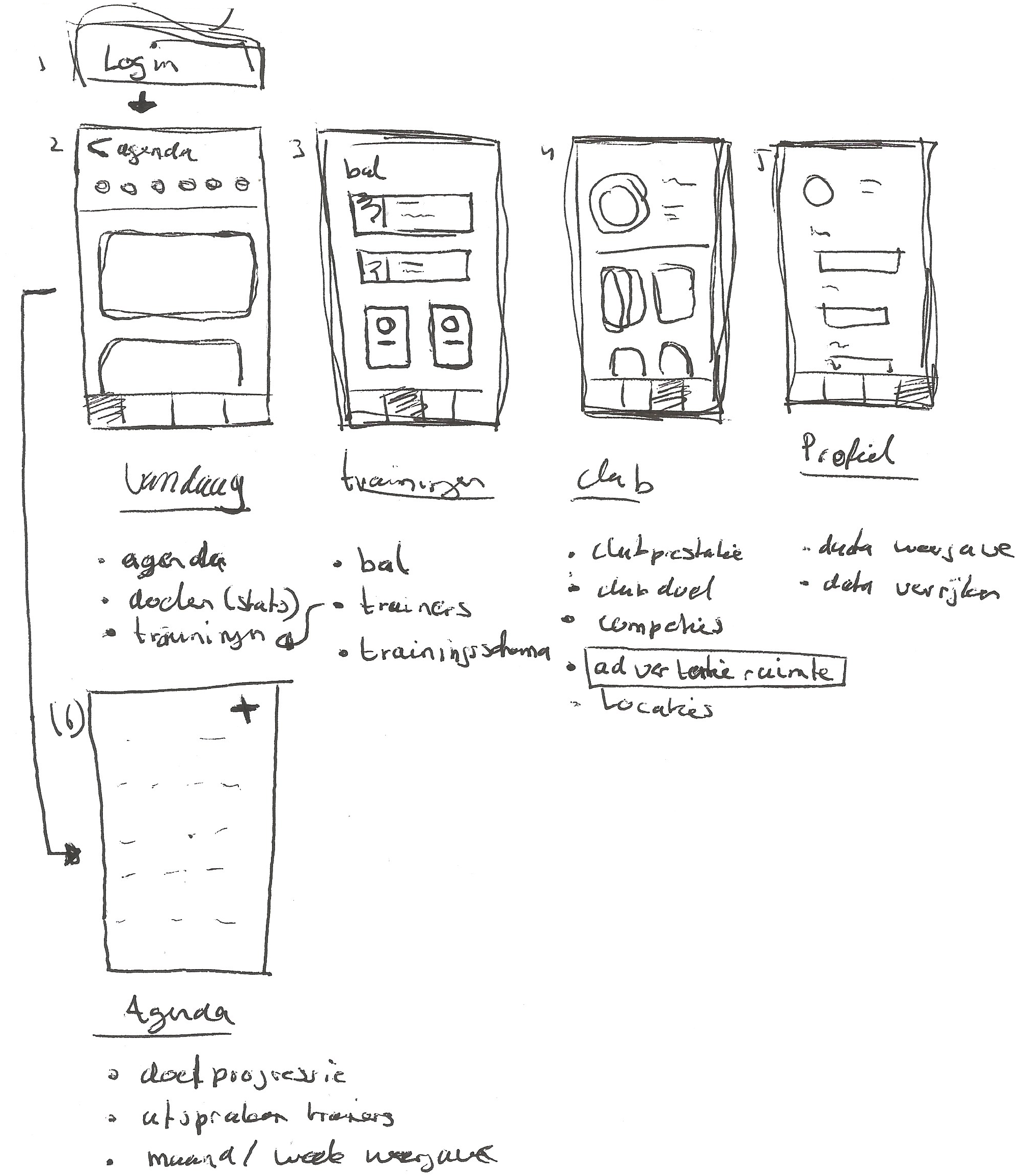 De app had vrij groot assortiment aan functionaliteiten. Deze konden onderverdeeld worden in de categorieën 'Vandaag', 'Training', 'Clubs' en 'Profiel'. Gebaseerd op de vereiste functies en haar categorieën heb ik de volgende user flow gemaakt.