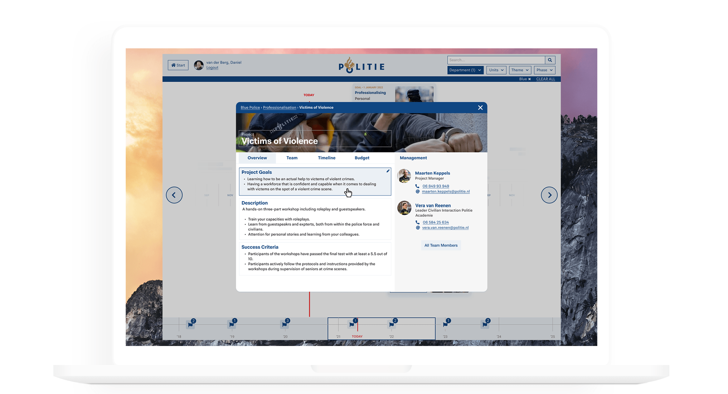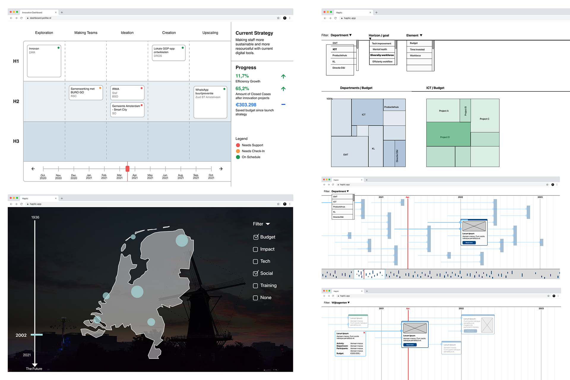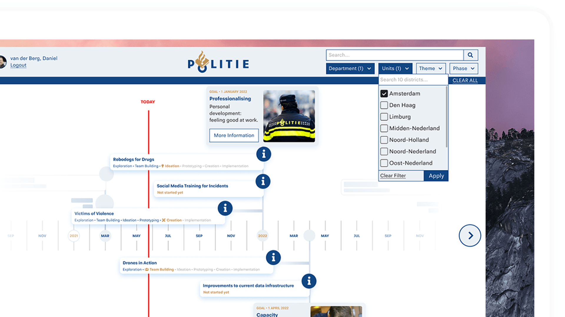 Het resultaat is een interactief platform die de realtime status van innovatie binnen de politie inzichtelijk maakt doormiddel van verhaalvertelling en het uitlichten van projectprocessen.
