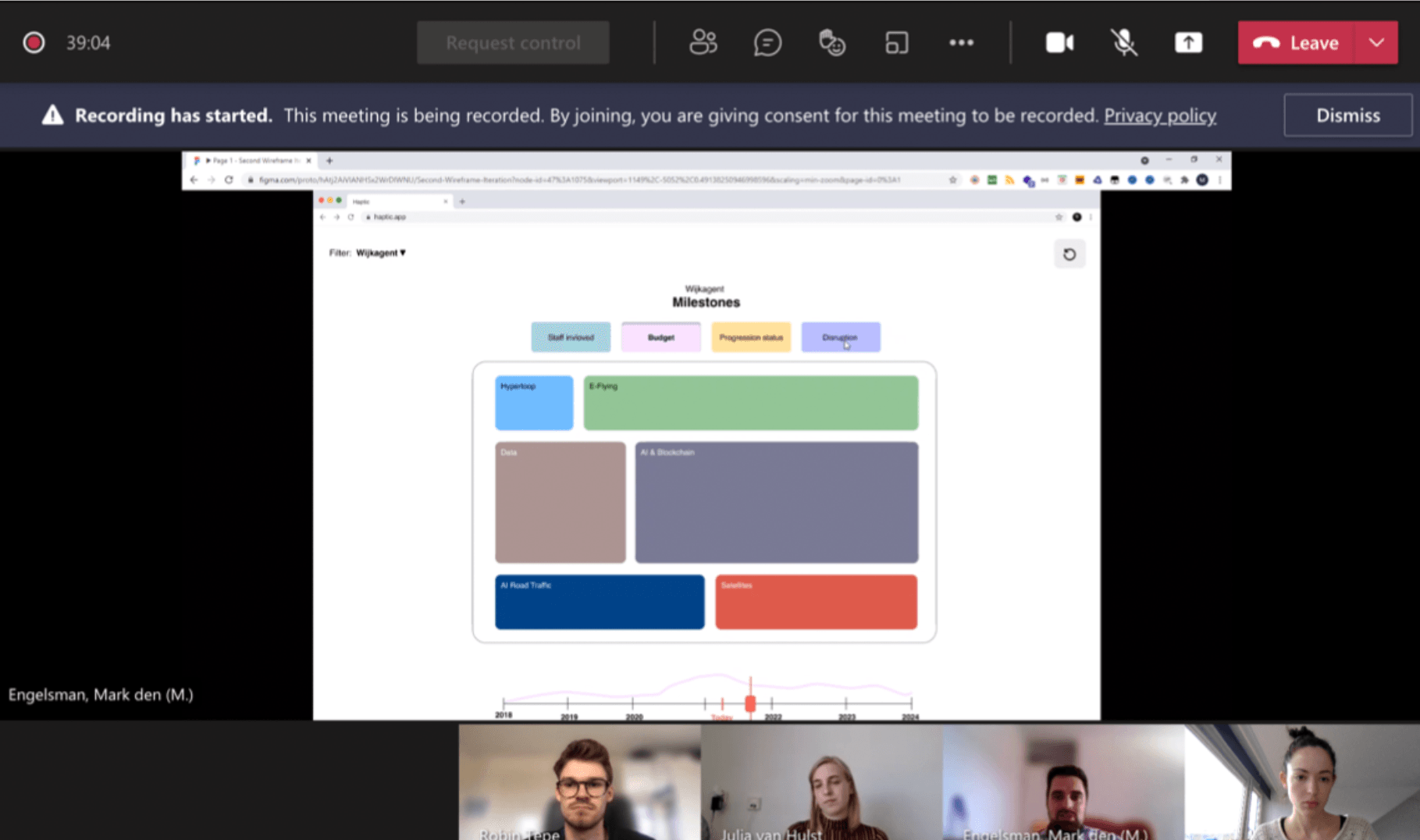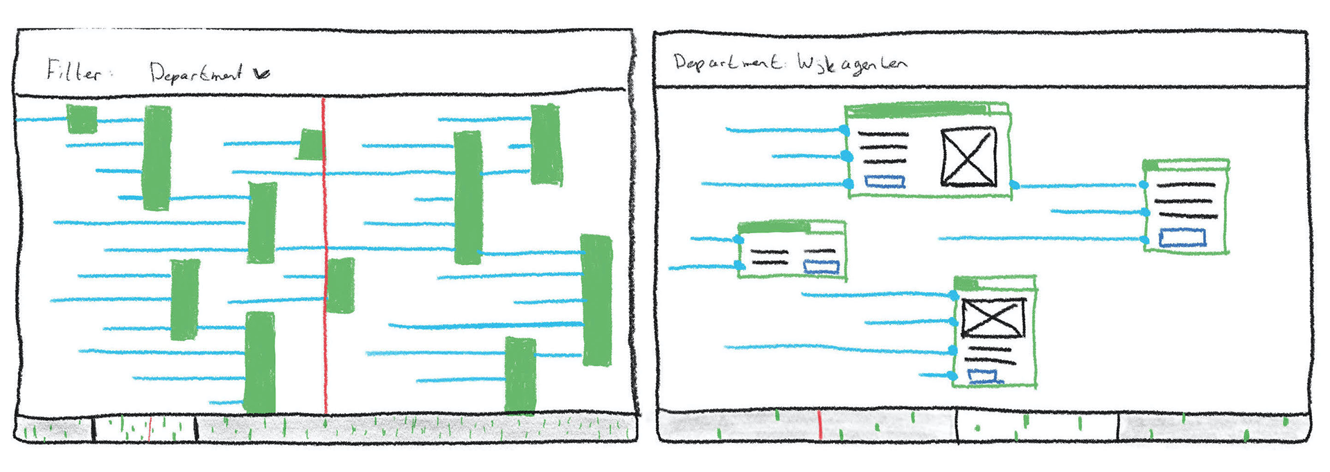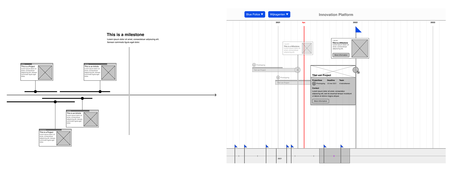 Een low fidelity prototype hielp ons om de wensen van de verschillende stakeholders beter in kaart te brengen. Management, tevens onze directe klantcontacten, hadden de wens voor een budget-gefussed platform. Maar tijdens het testen kwamen we erachter tot minstens 80% van de organisatie, budget irrelevant vindt. Daarnaast hielp deze vormgeving niet bij het oplossen van het eerder geïdentificeerde probleem dat innovatie binnen de organisatie een slecht imago heeft. Wetenschappelijke literatuur vertelt ons dat tijdlijnen een effectieve manier zijn voor verhaalvertelling. Om deze reden hebben we ook deze weergave getest en zagen dat deze aantrekkelijker was voor de stakeholders.