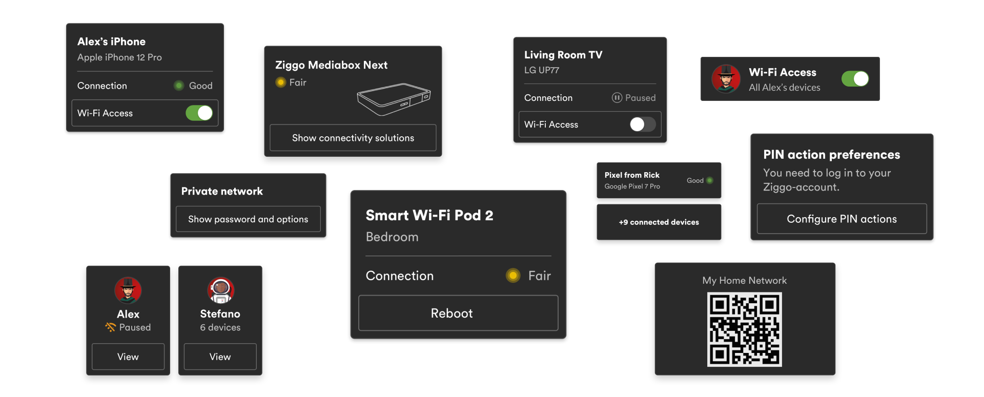 Tegels vormen het hart van het ontwerp, gezien deze de informatie en opties bieden waar de gebruiker naar op zoek is. Om deze reden is het belangrijk dat de tegels consistent zijn in haar vormgeving en tegelijkertijd altijd de optie aanbiedt die past bij de toepassing. Zo kan een device met één klik van het internet gepauzeerd worden terwijl, wanneer het internet van een device niet optimaal is, meerdere opties achter een detail pagina worden aangeboden.
